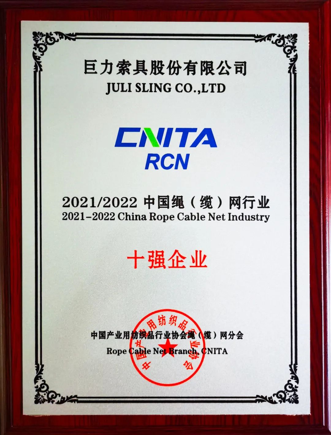 巨力索具荣获“2021/2022中国绳(缆)网行业十强企业”
