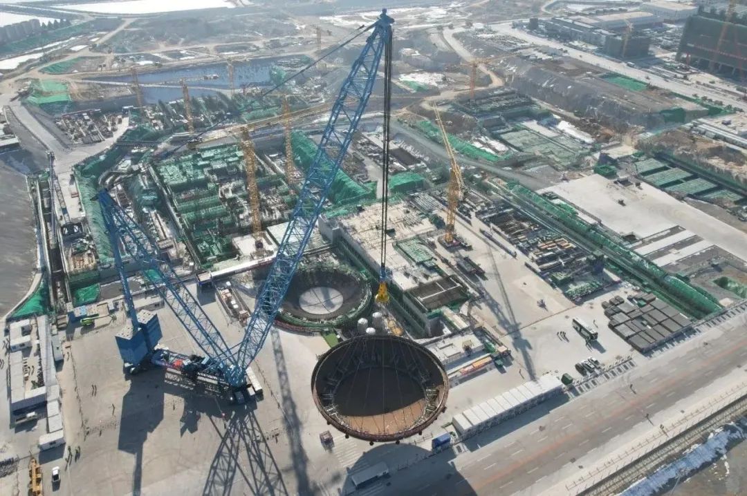 克日,徐大堡核电1号机组CV底封头吊装顺遂实现。 巨力索具成套吊装体系确保吊装进程稳步停止。