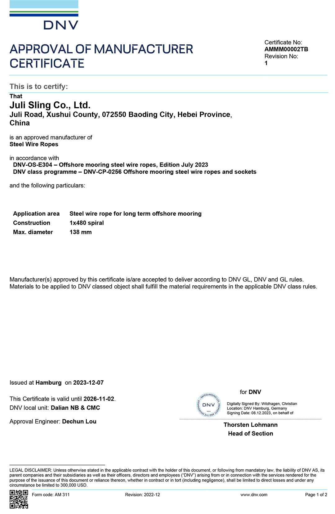 克日,巨力索具股分不限有限公司经过历程荷兰船级社(DNV)严格测试,仪式夺得DNV悍接工厂坦白合格证书!这里是巨力索具在中档制做概念赢得的另一国.际强权巨子坦白。