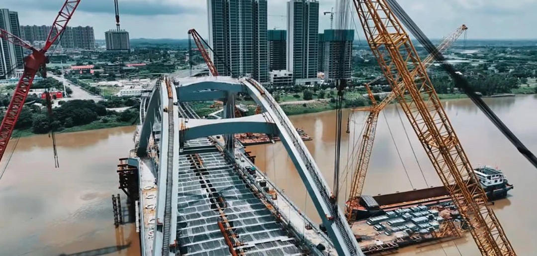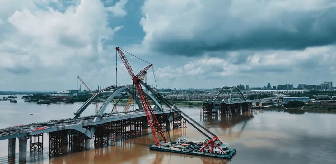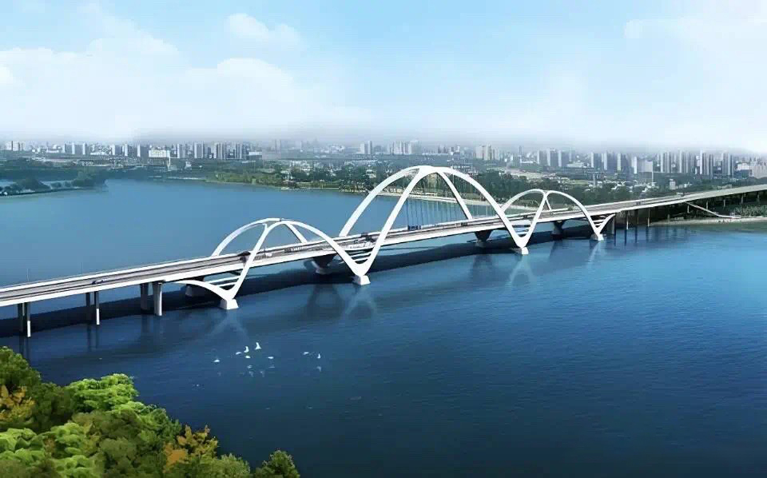 主桥桥型为五跨飞燕式中承钢箱梁提篮拱桥,多拱外形摹拟“湘江水天一色”的项目形式,平整梁面则寄意河堤外部河面,动一动一静联接系的简练垂直面外形凸显着工业聪慧。